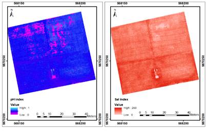 Fig. 4 shows the calculation of the spectral indices that yielded the best results. The pH_index stands out for indicating the degree of alkalinity of the soil, while the sal_index6 reflects the content of dissolved salts.