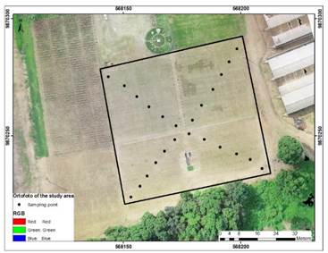 To define the sampling points systematically, a system of diagonal transects [24] was used in the study area as shown in [Fig. 2]. A total of 45 sampling points were surveyed Between July 20 and 22, 2023, coinciding with the end of the drought period in the area, which were georeferenced by means of a topographic implement called RTK (Real Time Kinematics) GPS model Topcon GR-5. With the coordinates generated by the RTK, a shapefile vector file was constructed, using ArcGIS software tools. Fields with the variables pH, EC and MO were added to the attribute table of the shapefile file with the data measured in the field and laboratory.