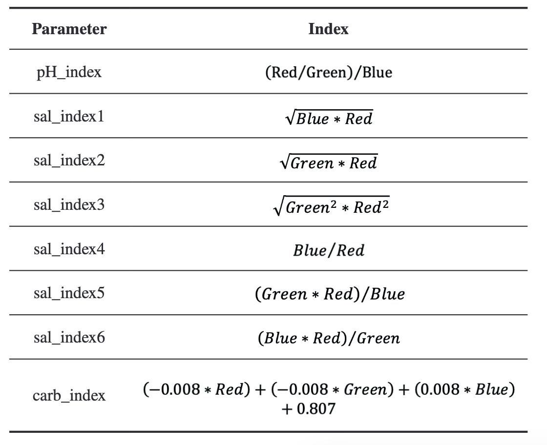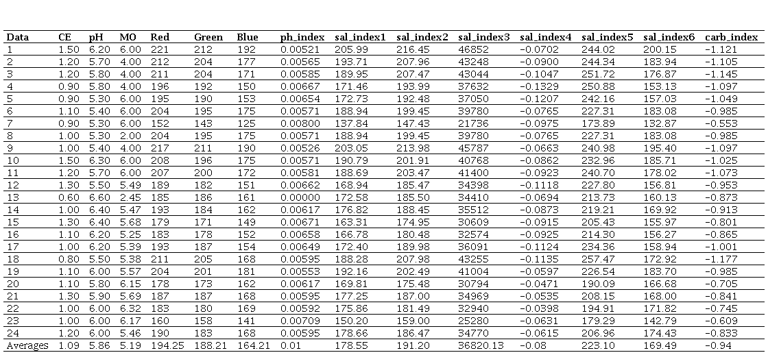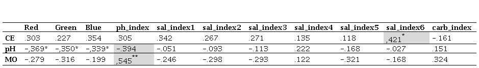 With the RGB spectral bands, the respective calculation of the indices shown in Table I was carried out. These have been reported in the literature as medium-power indices [28], [29] and [30], to determine chemical parameters of the soil (pH, salinity and organic matter), because they have only three bands of the electromagnetic spectrum [31].