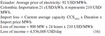 Finally, there is a hidden cost that is much more representative of the stoppages of the largest plant in Ecuador, so, as a second comparison, it has that every time there is a stoppage, Ecuador imports energy from Colombia to supply its demand, however, from journalism data, it is known that the kWh of the neighboring country is much more expensive when requiring this service as show Eq. 16: