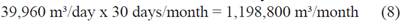 [Eq.5]b. Automatic Sediment Washing System (AWS): Implementing an autonomous sediment washing system requires calculating the amount of sediment removed monthly, and it is necessary to know the time it takes to remove the sediment [56]. Assuming that the removal time is a minimum of 60 minutes each day, the amount of sediment removed monthly is calculated as follows in equations 6 -7-8:
