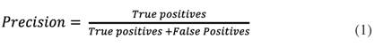 Precision (Prec): This metric focuses on the positive and false positive values; it is obtained from the total true positives divided by the sum of true positives and false positives (Eq. 1).