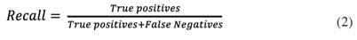 Recall: With the same principle as precision, but with the difference that it focuses on false negatives. It is calculated from the total of true positives divided by the sum of true positives and false negatives (Eq. 2).