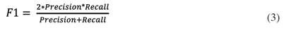 F1 Score (F1): This metric takes into consideration precision and recall. It is obtained from the double product of the multiplication of precision and recall divided by the sum of precision and recall (Eq. 3).