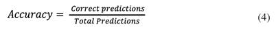 Accuracy (CA): Refers to the number of correct predictions divided by the number of total predictions (Eq. 4).