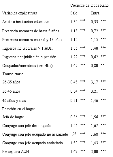 Los resultados de la tabla 1 se presentan mediante el cociente de OR que cuenta con la ventaja de focalizar su interpretación en la covariable respectiva, dado que compara dos individuos con las mismas características excepto la evaluada. Específicamente, mide las chances de salir/entrar del/al mercado de trabajo cuando la característica de la variable explicativa está presente, en relación con las chances de salir/entrar cuando no lo está: