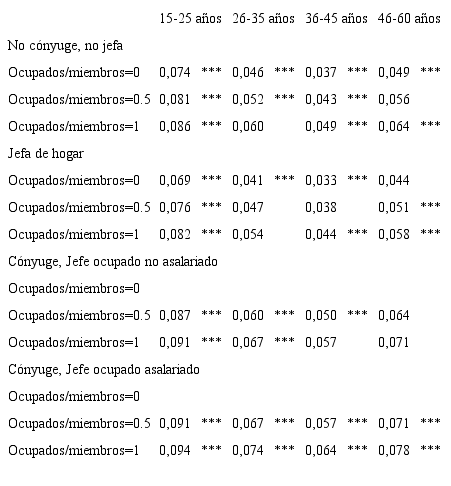 Fuente: elaboración propia sobre la base de EPH.*** Significativa al 1%** Significativa al 5%* Significativa al 10%Por otro lado, lo que se observa en la tabla 3 es que en todos los perfiles base, para todas las posiciones en el hogar y los tres niveles de proporción de ocupados sobre miembros, las mujeres que reciben la AUH tienen una mayor probabilidad de entrada al mercado laboral en relación con las que no la reciben: las primeras diferencias de probabilidad dan positivas (>0) y son estadísticamente significativas. En este caso, las primeras diferencias de probabilidad descienden a medida que aumenta la proporción de ocupados sobre miembros en el hogar, y las más altas primeras diferencias de probabilidad de entrada corresponden a la posición en el hogar “cónyuge con jefe ocupado no asalariado”.