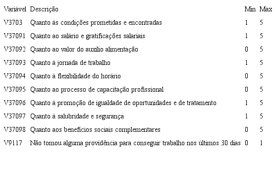 Variáveis de Satisfação: V3703: quanto às condições prometidas e encontradas; V37091: quanto ao salário e gratificações salariais; V37092: quanto ao valor do auxílio alimentação; V37093: quanto à jornada de trabalho; V37094: quanto à flexibilidade do horário; V37095: quanto ao processo de capacitação profissional; V37096: quanto à promoção de igualdade de oportunidades e de tratamento; V37097: quanto à salubridade e segurança; V37098: quanto aos benefícios sociais complementares; V9117: não tomou alguma providência para conseguir trabalho nos últimos 30 dias.