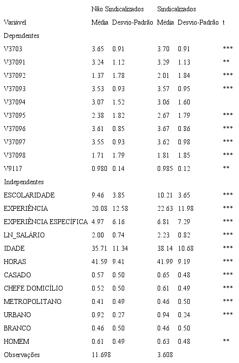 Fonte: Elaborado pelos autores a partir dos dados disponibilizados pela PNAD (2015).*** Significante a 1%** Significante a 5%* Significante a 10%V3703 quanto às condições prometidas e encontradasV37091 quanto ao salário e gratificações salariaisV37092 quanto ao valor do auxílio alimentaçãoV37093 quanto à jornada de trabalhoV37094 quanto à flexibilidade do horárioV37095 quanto ao processo de capacitação profissionalV37096 quanto à promoção de igualdade de oportunidades e de tratamentoV37097 quanto à salubridade e segurançaV37098 quanto aos benefícios sociais complementaresV9117 não tomou alguma providência para conseguir trabalho nos últimos 30 diasA inclusão de variáveis dependentes está baseada na literatura a respeito de satisfação laboral (Fiorillo & Nappo, 2014; Garcia-Serrano, 2009; Guerra & Patuelli, 2016; Holland et al., 2011). A princípio é possível constatar que, entre sindicalizados e não sindicalizados, todas as variáveis são estatisticamente diferentes, exclusive a variável de etnia, dividida em brancos (autodeclarados brancos e amarelos) e não brancos.