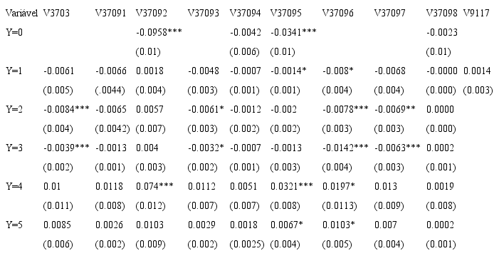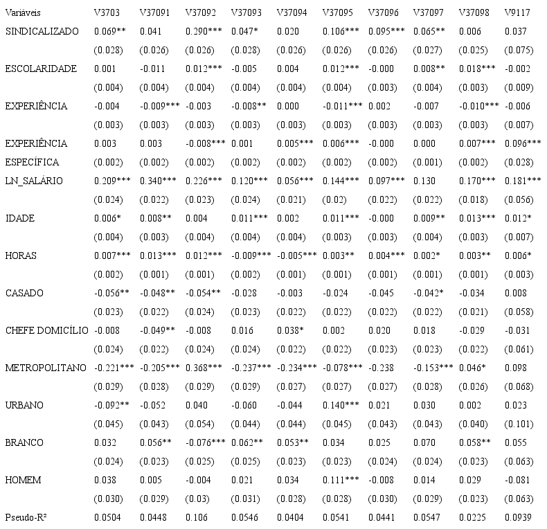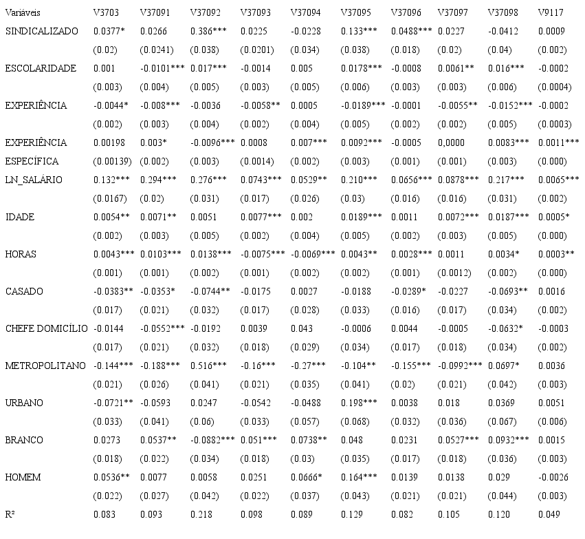 Fonte: Elaborado pelos autores a partir dos dados disponibilizados pela PNAD (2015).*** Significante a 1%** Significante a 5%* Significante a 10%V3703 quanto às condições prometidas e encontradasV37091 quanto ao salário e gratificações salariaisV37092 quanto ao valor do auxílio alimentaçãoV37093 quanto à jornada de trabalhoV37094 quanto à flexibilidade do horárioV37095 quanto ao processo de capacitação profissionalV37096 quanto à promoção de igualdade de oportunidades e de tratamentoV37097 quanto à salubridade e segurançaV37098 quanto aos benefícios sociais complementaresV9117 não tomou alguma providência para conseguir trabalho nos últimos 30 dias