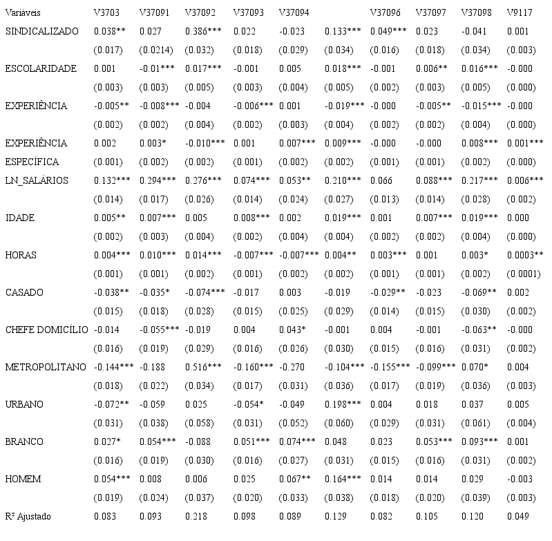 A Tabela 3 apresenta os resultados do modelo de Mínimos Quadrados Ordinários (MQO) para as variáveis de satisfação apresentadas na Tabela 1. A filiação a sindicatos mostra que os membros ou não possuem diferença estatística ou são mais satisfeitos que seus pares não sindicalizados. Os trabalhadores sindicalizados se mostram mais satisfeitos em relação às condições prometidas e encontradas, quanto ao valor do auxílio alimentação, quanto ao processo de capacitação profissional e à promoção de igualdade de oportunidade, destacando o papel equitativo dos sindicatos.
