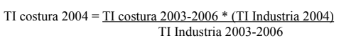 Con TI costura 2004 como tasa de informalidad laboral en la confección de prendas de vestir para el año 2004 calculada como el producto entre la tasa de informalidad laboral en el sector para el período 2003-2006 y la tasa de informalidad laboral de la industria de 2004, dividido por la tasa de informalidad laboral de la industria para el mismo período 2003-2006. Dada la importancia del trabajo por cuenta propia en este sector, se realizó el cálculo de la informalidad laboral para todos los ocupados (y no solo para los asalariados como hicieron Porta et al. [2016]).