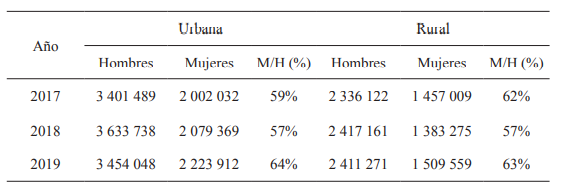 En el año 2018 las brechas de ingresos persisten tanto en la zona urbana y rural. Los hogares cuya jefatura del hogar es femenina perciben solamente el 57% de los ingresos de los hogares con jefatura masculina. Por último, pese a la disminución de las brechas salariales en el año 2019, las mujeres jefas de familia reciben 36% y 37% menos que los jefes de hogares varones en la zona urbana y rural.