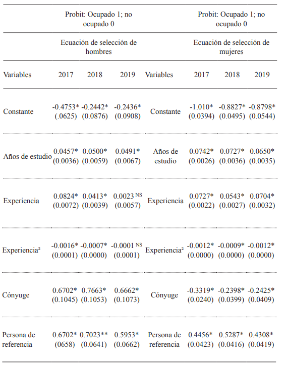 Es común en análisis de ecuaciones de salarios la presencia de sesgo de selección de la muestra. Por tanto, para evitar este problema se utiliza la corrección del sesgo de selección de Heckman (1979). El procedimiento consta de dos ecuaciones, la primera corresponde a la ecuación de selección que indica la probabilidad del individuo de estar empleado, y la segunda consiste en la ecuación de salarios de Mincer modificada (Verbeek, 2007). Por tanto, en este trabajo fueron estimadas las ecuaciones de selección y de ingresos por separado para hombres y mujeres en base a los períodos analizados.
