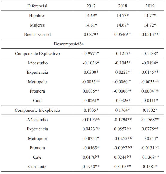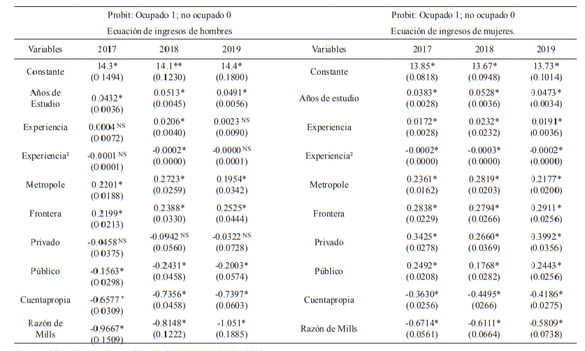 Los resultados indican que conforme a lo esperado, el salario de los hombres es superior a las mujeres aunque con una tendencia decreciente durante el período analizado. En consecuencia la discriminación por género en promedio es responsable del 17.67% de las diferencias en la remuneración entre ambos grupos. Así también, en relación con la zona de residencia del individuo, la zona metropolitana ayuda a disminuir las desigualdades de ingresos entre hombre y mujeres, en cambio, la zona fronteriza acrecienta las diferencias salariales. Por otro lado, el procedimiento de Heckman apuntó la necesidad de corregir la ecuación de salarios con el fin de obtener estimativas consistentes de los parámetros debido a la existencia de sesgo de selección muestral.