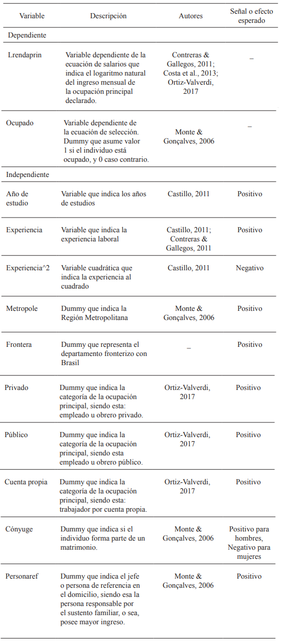 (2)Las variables explicativas corresponden a la teoría del capital humano (años de estudio, experiencia y experiencia al cuadrado), además de otras variables dummies como metropole, cuyo valor 1 representa la Región Metropolitana (Asunción y el Departamento Central); frontera, dummy cuyo valor 1 representa el departamento fronterizo con Brasil (Departamentos de Alto Paraná); conjunto de dummies que indican las categorías de la ocupación principal (empleado u obrero público; empleado u obrero privado; trabajador por cuenta propia); λ, es la razón inversa de Mills o lambda; y μ2, es el término de error.