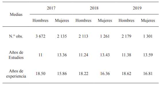 Primeramente, en la tabla 1 se observa que la muestra está dividida de la siguiente forma: en el año 2017 se encontraban en el sector formal de la economía según la categoría de ocupación principal 3 672 varones y 2 135 mujeres, luego, en el 2018 habían 2 113 varones y 1 261 mujeres, y finalmente, en el año 2019 el mercado estaba conformado por 2 179 hombres y 1 301 mujeres, lo que indica una mayor cantidad de empleados varones en esa categoría. Además, en relación con las variables del capital humano, las mujeres en promedio poseen una mayor escolaridad que los varones, y por el contrario, los hombres presentan mayor experiencia laboral que las mujeres.