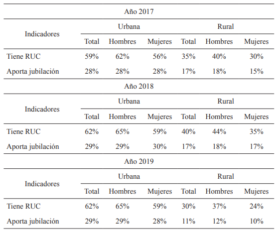 A continuación, en la tabla 3 se presentan los indicadores de empleo formal de la categoría de la ocupación principal por área de residencia y sexo. En general se considera que un individuo se encuentra en el sector formal de la economía si está registrado en el Registro único del Contribuyente (RUC) en el caso de los trabajadores independientes, o si aporta a un sistema de jubilación o pensión en el caso de los dependientes. En esta perspectiva, se observa que en el año 2017 el 59% de los individuos desempeñaban sus actividades laborales en un establecimiento económico con RUC y solo el 28% realizó aporte jubilatorio. Estas cifras aumentaron en los siguientes años (2018-2019), a 62% y 29% respectivamente.