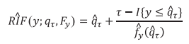 (5)O segundo estágio é utilizado para calcular a contribuição detalhada em ambos componentes. Os autores usam regressões-RIF, em que a variável de resultado, Y, é substituída pela função de influência recentrada, permitindo a estimação do efeito das mudanças de um conjunto de covariadas X na estatística da distribuição marginal de Y. Primeiro, o cálculo da RIF é realizado para os quantis, como na equação (6):