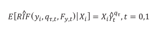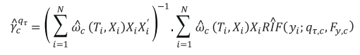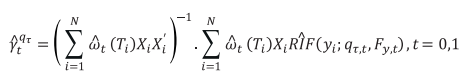 Substituindo os valores de Yi da equação (1) pelos valores de obtidos em (6), regressões quantílicas para cada grupo T podem ser estimadas por mínimos quadrados ordinários, tal como a equação (7):