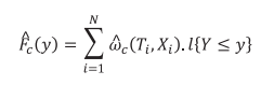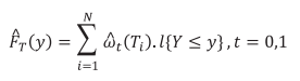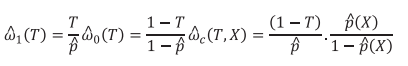 em que, T indica a que grupo o i-ésimo estudante pertence, 0 ou 1 e é a probabilidade de pertencer ao grupo 1 dado X. Os pesos são utilizados para obter as distribuições acumuladas de cada grupo T e a distribuição contrafactual: