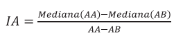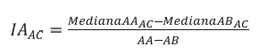 Esse índice tem a finalidade de analisar descritivamente o efeito de ancoragem. Ele é capaz de mensurar o movimento da estimativa mediana dos sujeitos ancorados em direção à âncora à qual foram expostos. Seus valores variam entre 0 e 1, onde 0 representa nenhum efeito de ancoragem e 1 significa que a estimativa mediana dos sujeitos coincide com a âncora a eles exposta. Valores maiores que 1 também são possíveis (Jacowitz; Kahneman, 1995). O IA para estimação de problemas particulares é definido conforme na Equação (1)2: