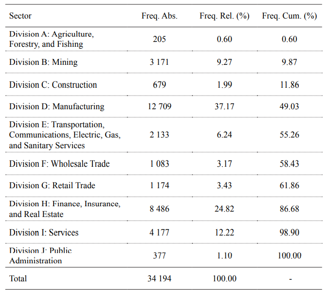 Firms identified with the digit-1 of the ‘SIC Codes’ corresponding to 10 sectors;