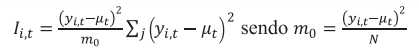 em que yi,té a observação da variável de interesse na microrregião i para o ano t, ut é a média das observações entre as microrregiões para o ano t para a qual o somatório em relação à j é tal que somente os valores vizinhos de j são inclusos.