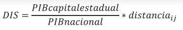 A variável DIS representa o custo de transporte, ou seja, mensura a proximidade e o acesso aos mercados consumidores. Vários autores (Von Thünen (1826), Weber (1929), Hoover (1948), Greenhurt & Greenhurt, (1975), entre outros) destacam a importância dos custos de transporte e afirmam que a indústria se localiza onde esses custos são minimizados, pois quanto menor o custo de transporte, maiores serão as vantagens locacionais que a indústria terá em se instalar nessas localidades. Para a construção dessa variável, utilizou-se o mesmo procedimento realizado por Gotardo (2016), onde se levam em conta as distâncias rodoviárias de cada mercado. Considerando como mercado as capitais estaduais, mensurou-se a distância rodoviária de cada microrregião com sua respectiva capital estadual. Após calculadas as distâncias rodoviárias, realizou-se uma ponderação dessas distâncias com o objetivo de se corrigir vieses de mensuração. Para o cálculo da proxy da distância, utilizou-se a fórmula