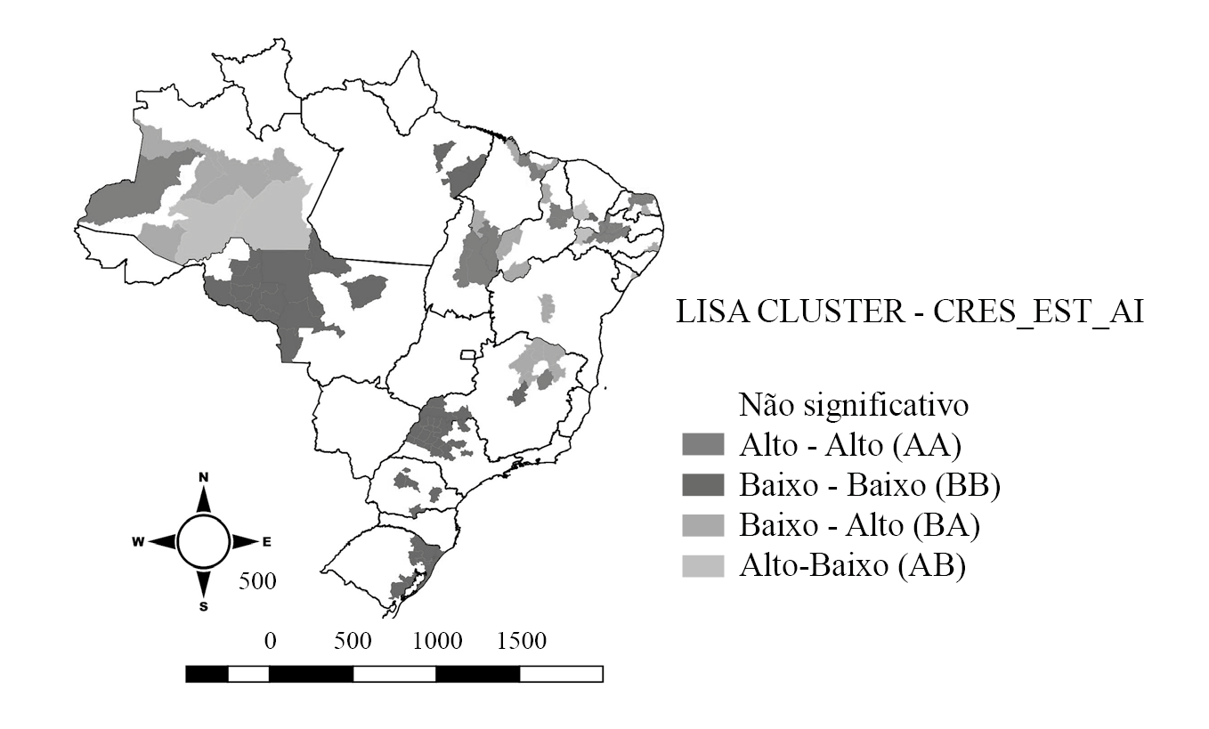A estatística I de Moran mostra indícios da presença de dependência espacial, porém uma complementação da análise necessita ser realizada. Para tanto, utilizou-se a estatística LISA. Os indicadores LISA podem ser visualizados pelo mapa de clusters (Figura 2). Este mapa apresenta informações sobre o tipo de autocorrelação espacial que existe entre as localidades que apresentaram indicadores LISA significativos. Por esse mapa podem-se identificar as informações de clusters espaciais em quatro categorias de observações: AA (Alto-Alto), BB (Baixo-Baixo), AB (Alto-Baixo) e BA (Baixo-Alto).