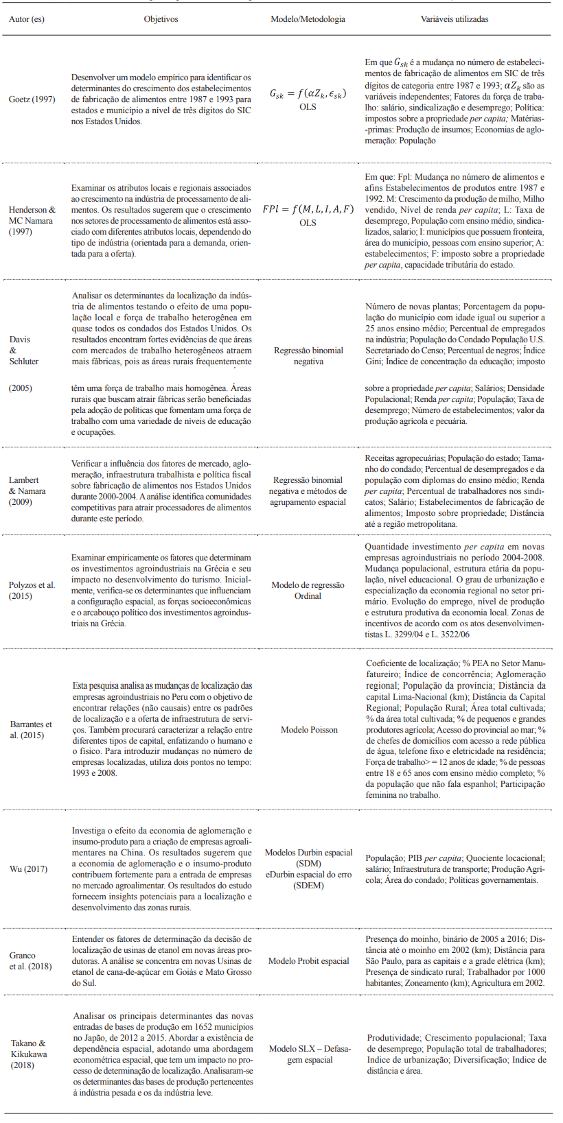 Ao longo dos últimos anos, diversos estudos foram realizados com os objetivos de analisar a localização industrial e identificar os fatores locacionais que refletem as reais decisões de localização da planta industrial (Gotardo, 2016). Tais pesquisas utilizaram diferentes bases de dados e distintas metodologias. Em meio a esses estudos podem ser destacados os que enfatizam a localização da agroindústria, tais como Goetz (1997), Henderson & Namara (1997), Davis & Schluter (2005), Lambert & Namara (2009), Polyzos et al. (2015), Barrantes et al. (2015), Wu (2017), Granco et al. (2018) e Takano & Kikukawa (2018). O Quadro 1 foi construído com base nos trabalhos mencionados e permite ter uma visão resumida dos estudos realizados. Destarte, a apresentação desses estudos busca verificar as variáveis utilizadas na especificação dos modelos referentes aos determinantes da localização da indústria e do crescimento dos estabelecimentos industriais.