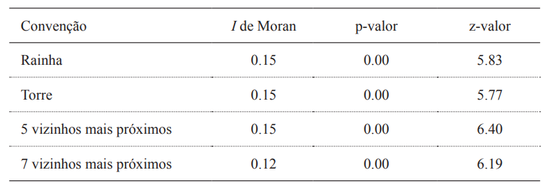 Na Tabela 2 são apresentados os resultados do índice I de Moran, considerando-se as matrizes, torre, rainha e k vizinhos mais próximos. Verifica-se que todos os valores do I de Moran são positivos e estatisticamente significativos a 1%, revelando similaridade entre os valores e a localização espacial das microrregiões. Nesse caso, é possível afirmar que as microrregiões com elevada taxa de crescimento dos estabelecimentos da agroindústria estão rodeadas por microrregiões que também possuem elevada taxa de crescimento, ao passo que microrregiões com baixos valores tendem a estar rodeadas por vizinhos que também apresentam baixos níveis de crescimento dos estabelecimentos da agroindústria.