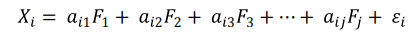(1)Em que Xisão as variáveis, ai é o grau de correlação entre as variáveis e os fatores (também denominado de cargas fatoriais), Fj são os fatores comuns não correlacionados entre si e εi é o termo de erro. Portanto, pela equação (1) é demonstrado que a variação total de cada variável é explicada tanto por um fator de variabilidade comum (que são os fatores) como por um elemento de variação especifico. Desta forma, o termo de erro da equação (1), concentra as variações que são exclusivas da variável e não podem ser explicadas pelos fatores comuns dos elementos.