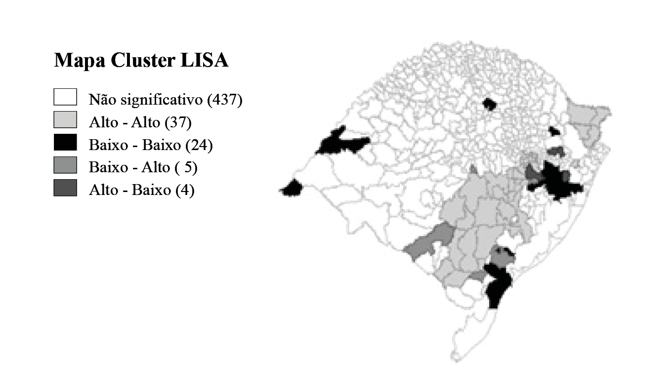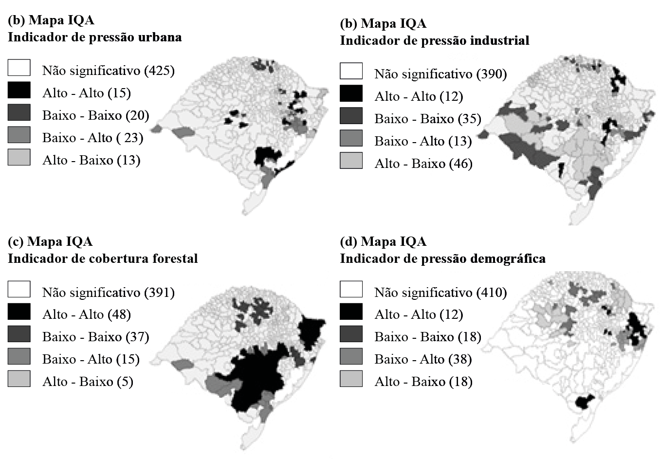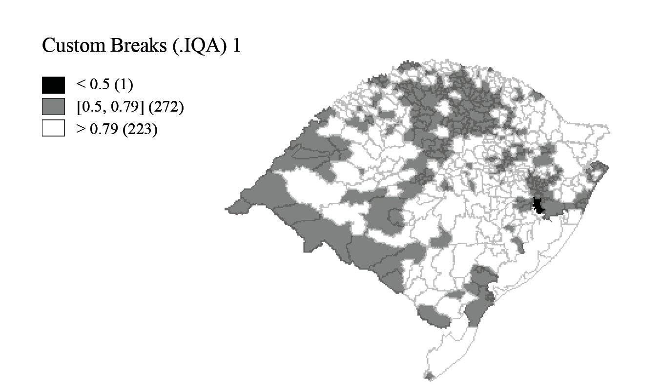 Portanto, a utilização da análise fatorial permitiu a fusão de variáveis semelhantes para a criação de fatores (indicadores), os quais permitiram analisar as características do Rio Grande do Sul, bem como possibilitou a criação de índices municipais de qualidade ambiental (IQA). A análise exploratória de dados espaciais permitiu que pudessem ser realizadas as relações entre o IQA e cada indicador construído, revelando-se uma ferramenta importante para a demonstração empírica das características municipais do estado.