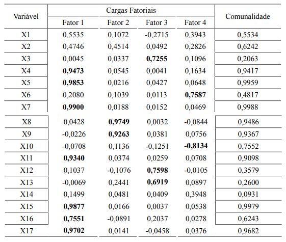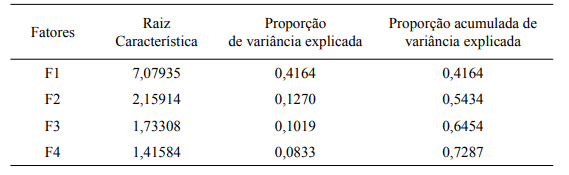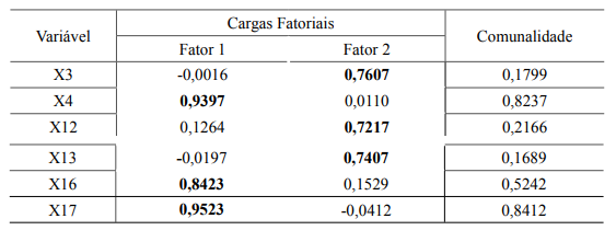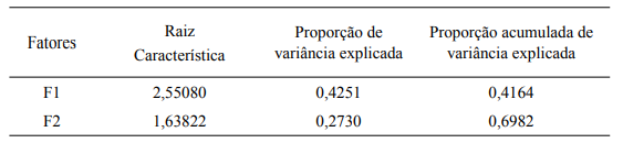Identifica-se na tabela 3 que, pelo critério da raiz característica, foram obtidos 2 fatores que, conjuntamente, explicam 69,82% da variância total dos dados. Além disso, no quadro 3 são expostas as cargas fatoriais e as comunalidades de cada variável após a rotação pelo método varimax.