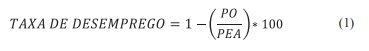 Para o cálculo da taxa de emprego nos setores econômicos, foi calculada a razão entre o número de pessoas ocupadas de cada setor e o número total de pessoas ocupadas. Já as taxas de desemprego (rural e urbana), foram calculadas pela fórmula (1), metodologia utilizada por Ipardes (2004, p. 64). Dessa maneira, foram utilizadas a PO e a PEA da área urbana e rural.