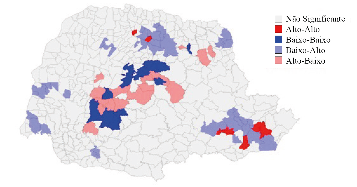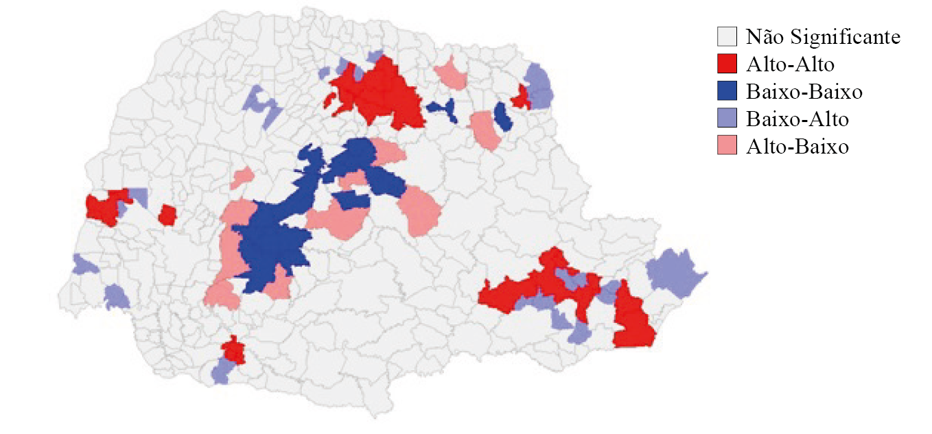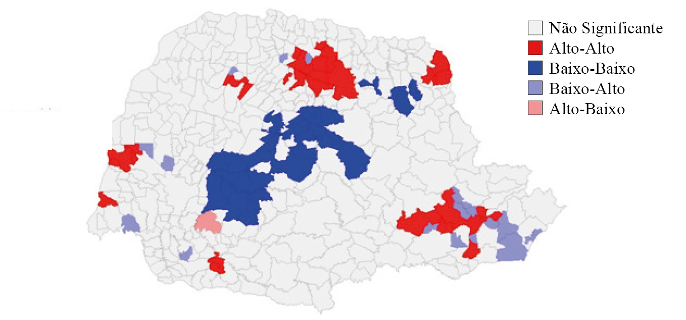 Observa-se na Tabela 3 que o I de Moran é positivo, logo, os padrões Baixo-Baixo e Alto-Alto predominam no mapa (Figura 2). Com base nisso, partes das mesorregiões Centro Sul e Norte Pioneiro formaram aglomerações de municípios padrão Baixo-Baixo.