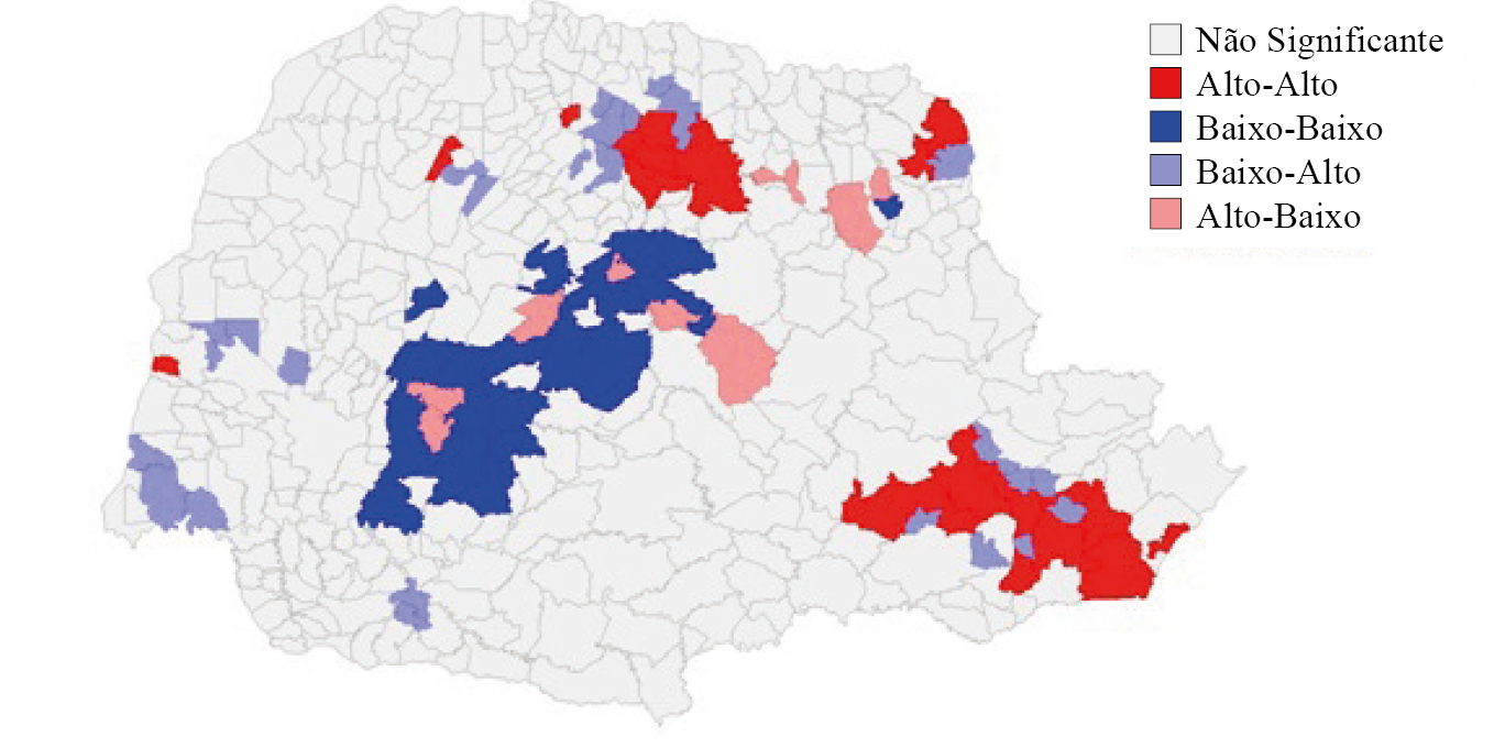 Já os outros dois clusters localizam-se nas mesorregiões Norte Central e Metropolitana de Curitiba, e foram caracterizados pelo padrão Alto-Alto, ou seja, nessas aglomerações de municípios, o mercado de trabalho é mais desenvolvido, principalmente porque possui uma maior geração de emprego nos setores da indústria, comércio e serviços. O desenvolvimento regional das mesorregiões metropolitanas é pautado em uma interação urbano-industrial e apresentou um padrão Alto-Alto. Em contraste, parte das mesorregiões Centro Ocidental, Centro Sul e Norte Pioneiro apresentou uma interação rural-urbana, refletindo assim em um padrão Baixo-Baixo para as atividades econômicas nessas mesorregiões.