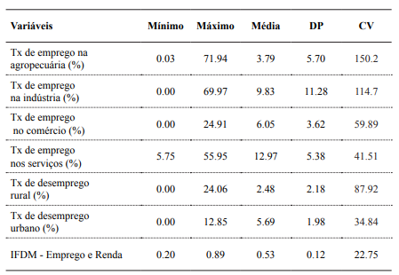 O uso da estatística descritiva permitiu analisar elementos referentes às medidas de posição e dispersão como o valor máximo e mínimo das variáveis em estudo, a média de cada variável, o desvio padrão e o coeficiente de variação.