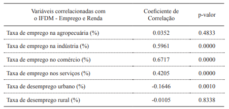 Com o objetivo de analisar se existe uma relação linear entre o IFDM – Emprego e Renda e as variáveis referentes ao mercado de trabalho, a Tabela 2 apresenta os valores do Coeficiente de Correlação e seus respectivos p-valores.