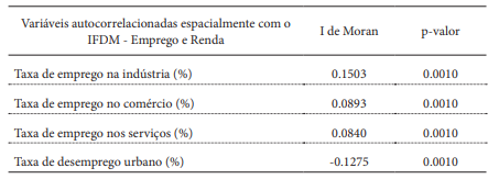 A Tabela 3 mostra que as quatro variáveis que foram testadas apresentaram autocorrelação espacial com o IFDM – Emprego e Renda (IFDM-ER), ou seja, seu p-valor foi significativo a um nível de 5%.