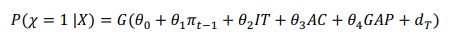 Donde πt-1es la tasa de inflación al inicio del episodio, es una variable dummy que toma valores igual a uno si hay un régimen de inflation-targeting, indica el grado de anclaje cambiario para el horizonte Hπ, GAP es una variable que representa la brecha de producto (exceso de demanda), y, finalmente, dT son un conjunto de variables binarias por década utilizadas como controles de efectos temporales.