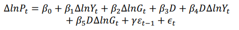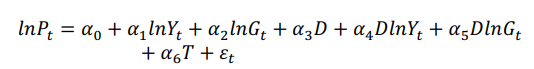 (2)Donde Pt es el indicador de pobreza o indigencia, Yt es el ingreso familiar por adulto equivalente, Gt es el índice de Gini, T es la tendencia, D es la variable dicotómica, αi son las elasticidades de largo plazo, βi son las elasticidades de corto plazo, γ es el factor de corrección de error, ln es el logaritmo neperiano y ∆ es el operador de primeras diferencias.