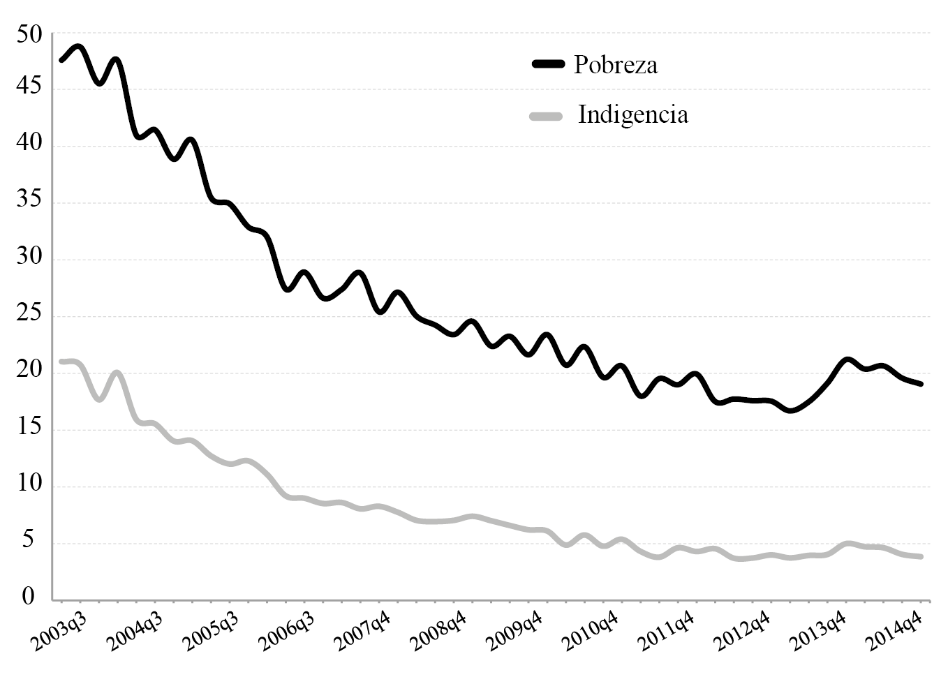 Tras la salida del régimen de Convertibilidad, la situación social argentina era alarmante, con más de la mitad de la población sumergida en la pobreza y más de la quinta parte en la indigencia. Pero, a partir de la segunda mitad de 2002, el país comenzó a recuperarse y alcanzó hasta 2011 un fuerte crecimiento económico. Asimismo, esta expansión fue pro-pobre, es decir, no solo permitió la salida de muchas familias de la pobreza y la indigencia, sino que los ingresos de los estratos más bajos fueron los que presentaron un mayor incremento en el período. En efecto, aun siendo un período de elevado aumento del ingreso, fue el efecto distribución el causante principal de las mejoras. Sin embargo, a partir de 2012, el crecimiento y la distribución del ingreso se estancaron y, por lo tanto, las mejoras sociales se interrumpieron e incluso mostraron un leve deterioro. En definitiva, a 2015 el país presenta una situación social preocupante que significa una leve mejora en relación a la década de 1990, pero un claro deterioro en relación a las décadas de 1970 y 1980.