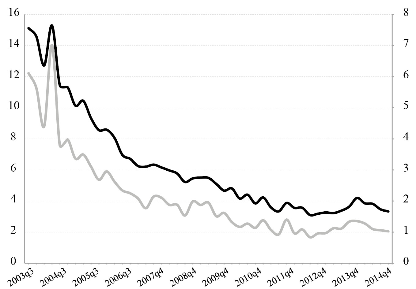 Las brechas de pobreza e indigencia en la Argentina durante el período analizado siguieron una evolución similar a las tasas, al caer fuertemente hasta el tercer trimestre de 2006, para luego seguir disminuyendo a un ritmo menor hasta 2013, cuando revirtieron tendencia. Estos indicadores son también muy ilustrativos de la magnitud problema de la pobreza e indigencia en términos de ingreso. Así, hacia 2003 era necesario una transferencia equivalente al alrededor del 14% del ingreso total para eliminar la pobreza y del 2,4% para la indigencia. Al segundo trimestre de 2015, esos porcentajes habían bajado a 2,5% y 0,3%, respectivamente (gráfico 2).
