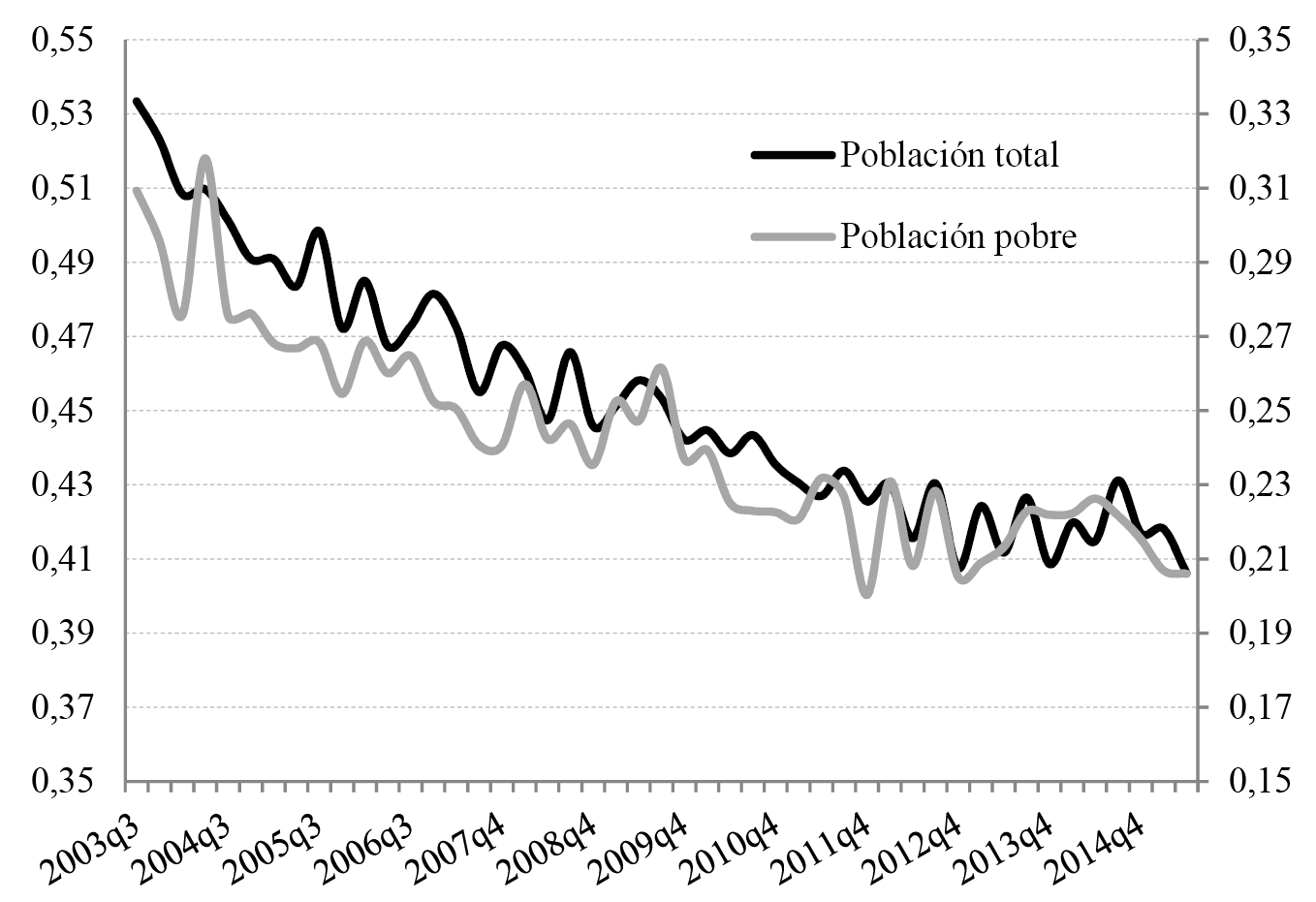 Entonces, entre 2003 y 2015, incluso habiendo sido un período de elevado crecimiento (al menos hasta 2011), la distribución del ingreso fue el efecto más importante en la mejora de la mayor parte de los indicadores sociales3. Al respecto, el índice de Gini mostró una notable mejora entre 2003 y 2012, para luego estabilizar su tendencia aunque con bastante volatilidad. Este comportamiento se observa no solo al tomar los ingresos de toda la población, sino también en el caso de considerar únicamente los ingresos de los pobres (Figura 4). Justamente, la mejora en la distribución del ingreso al interior de la población pobre es la causante de que el efecto distribución sea un factor más relevante para explicar la caída en las brechas al cuadrado en relación a las brechas y a las tasas.