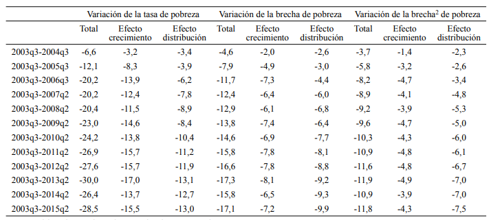Como se mencionó previamente, los indicadores de pobreza varían básicamente por dos fenómenos diferenciables: el crecimiento y la distribución del ingreso. Es por eso que resultó interesante hacer esta descomposición para el caso argentino en el período de estudio. De esta forma, no solo se puede analizar cuál de estos efectos fue el más importante para explicar la recuperación de las condiciones sociales en el país entre 2003 y 2015, sino que las series desagregadas se van a utilizar como ejercicio de robustez en las estimaciones de las elasticidades ingreso y distribución de la pobreza y la indigencia.