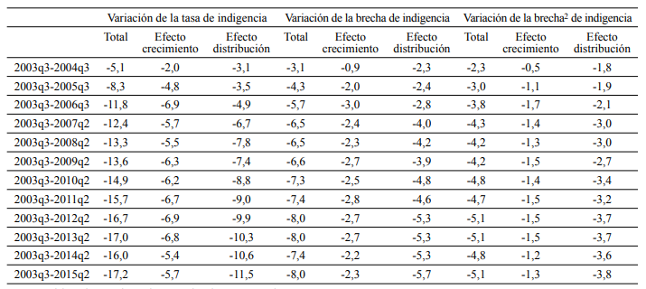 En lo que sigue, entonces, se analiza la contribución de estos dos efectos a la recuperación de los indicadores sociales en la Argentina entre 2003 y 2015. Como puede verse en las Tablas 1 y 2, excepto para la brecha al cuadrado de la indigencia, en todos los indicadores el efecto crecimiento fue el factor más importante para explicar las mejoras al inicio del período, pero desde mediados de 2006 ha ido perdiendo relevancia. En la comparación punta a punta, es decir, entre el tercer trimestre de 2003 y el segundo de 2015, el crecimiento explica 15,5 puntos porcentuales (p.p.) de un total de 28,5 p.p. de caída en la tasa de pobreza (lo que representa el 54,4% del total), quedando los 13 p.p. (45,6%) restantes para la distribución. A medida que se va pasando a los indicadores de brecha, el efecto crecimiento va perdiendo poder explicativo, en detrimento del distribución. Así, de la caída de 17,1 p.p. de la brecha de pobreza y de 11,8 p.p. de la brecha al cuadrado, 7,2 p.p. (42,1%) y 4,3 p.p. (36,4%) son consecuencia del aumento en el ingreso, mientras que 9,9 p.p. (57,9%) y 7,5 p.p. (63,6%), respectivamente, de la distribución (Tabla 1).