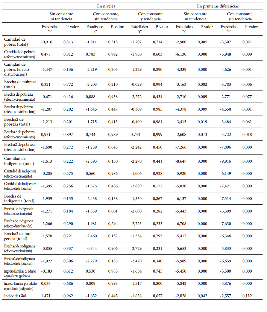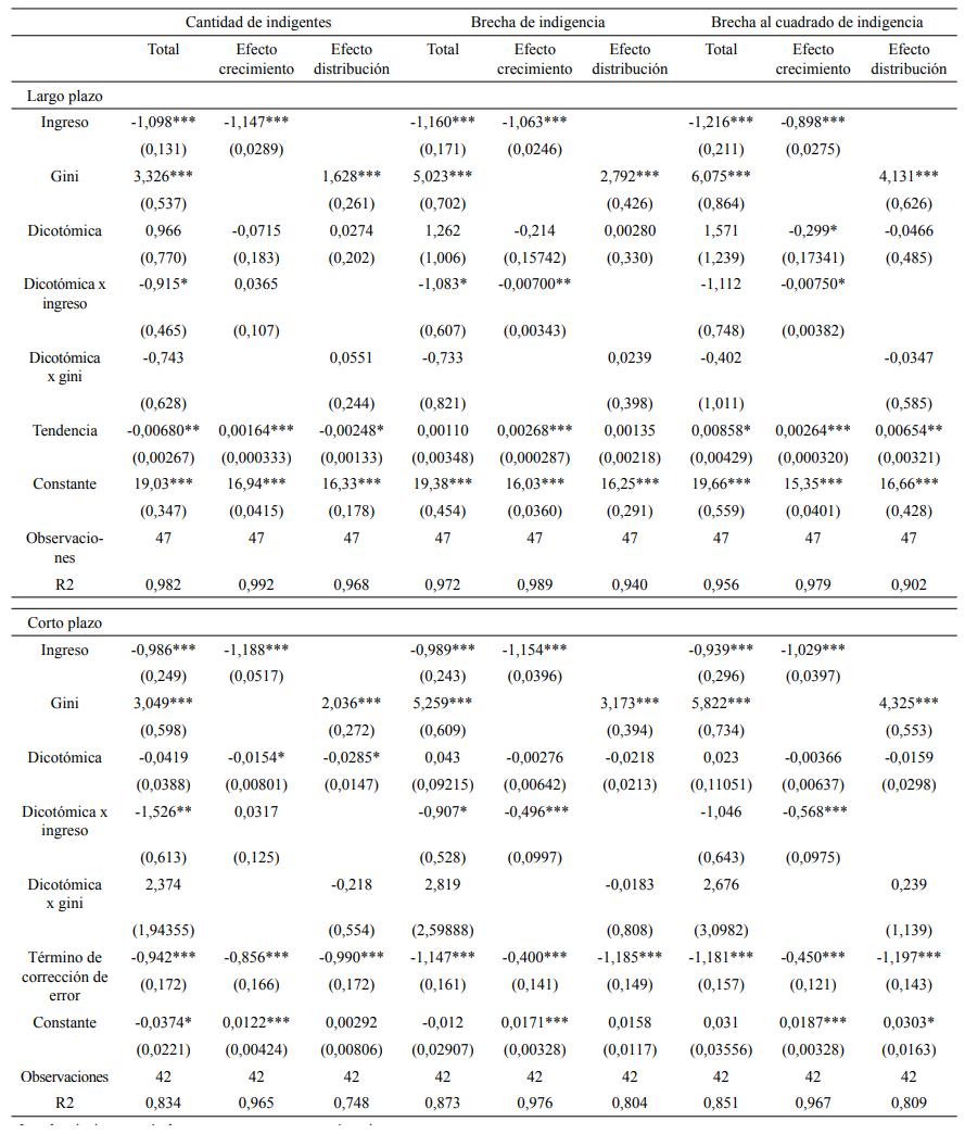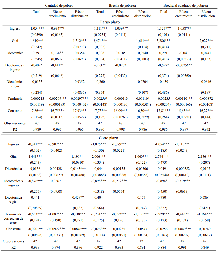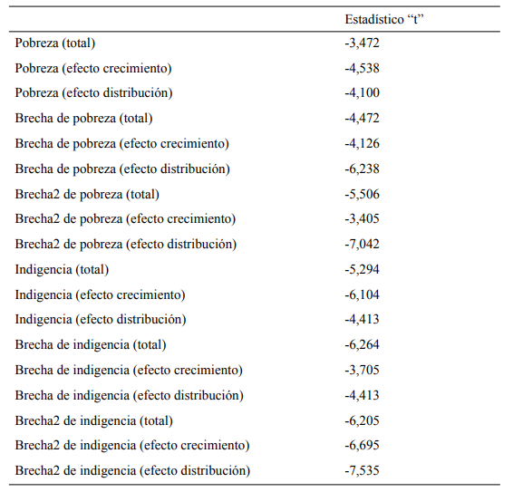 Como se ha visto en la sección anterior, la variación de los tres indicadores de pobreza e indigencia pueden ser desagregados a partir del efecto crecimiento y distribución. Por lo tanto, el ejercicio planteado recientemente se realiza no solo para la variación total de los indicadores, sino también para la variación resultante únicamente del crecimiento del ingreso, por un lado, y del efecto distribución, por el otro. Claro está que la única variable explicativa en el primer caso es el ingreso, mientras que en el segundo solo se utiliza al índice de Gini.
