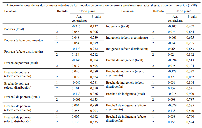 Como se desprende de la metodología, el primer paso es analizar el orden de integración de las variables. Para ello, como se muestra en la Tabla A.1 del apéndice, se realizaron los contrastes de raíces unitarias a través del test de Dickey-Fuller (1981) y en ningún caso se puede rechazar la hipótesis nula de raíz unitaria para los niveles de las variables (en logaritmos). En cambio, los contrastes de raíz unitaria de los residuos de las ecuaciones de largo plazo dieron como resultado el rechazo de la hipótesis nula de raíz unitaria, por lo que se pueden considerar estacionarios9 (TablaA.2). De esta manera, se puede suponer la existencia de relaciones de cointegración entre las variables. Por último, la Tabla A.3 del apéndice muestra, a través del estadístico de Ljung-Box (1978), que no hay evidencia para rechazar la hipótesis nula de que los residuos de todas las ecuaciones de corto plazo sean ruido blanco, por lo que se admite la adecuación del modelo de corrección de error.